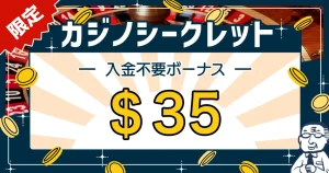 カジノシークレットの入金不要ボーナスは、ボーナス額が$35で出金上限が$350という高額なリターンが魅力です。