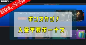 【5,000円】当サイト限定のボンズカジノ入金不要ボーナスの受け取り方法 ボンズカジノの入金不要ボーナスは、当サイトからの限定登録で5,000円を受け取ることができます。 そんなボンズカジノの入金不要ボーナスについて、受け取り方や出金条...